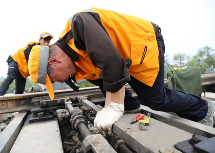 圖為該段職工正在秋檢中調(diào)整道岔壓力。